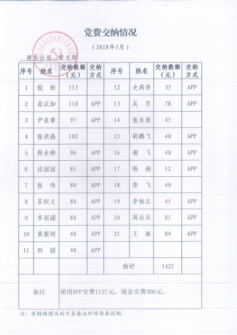 建發(fā)公司黨支部2018年5月份黨費交納公示