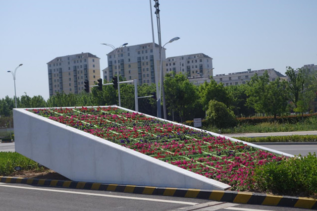 精神堡壘斜面長(zhǎng)約8.5米,寬約3.2米,本次栽植的鮮花主要利用大紅色、粉紅色矮牽牛與紫色矮牽牛相互搭配,形成一幅美麗的圖案,再次為園區(qū)入口形象增添光彩。