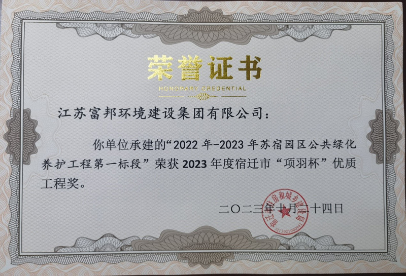 近日,由宿遷市蘇宿園區(qū)建設(shè)發(fā)展有限公司負責管理的蘇宿工業(yè)園區(qū)2022-2023年公共綠化養(yǎng)護工程第一、二標段,同時榮獲2023年度宿遷市項羽杯優(yōu)質(zhì)工程獎。