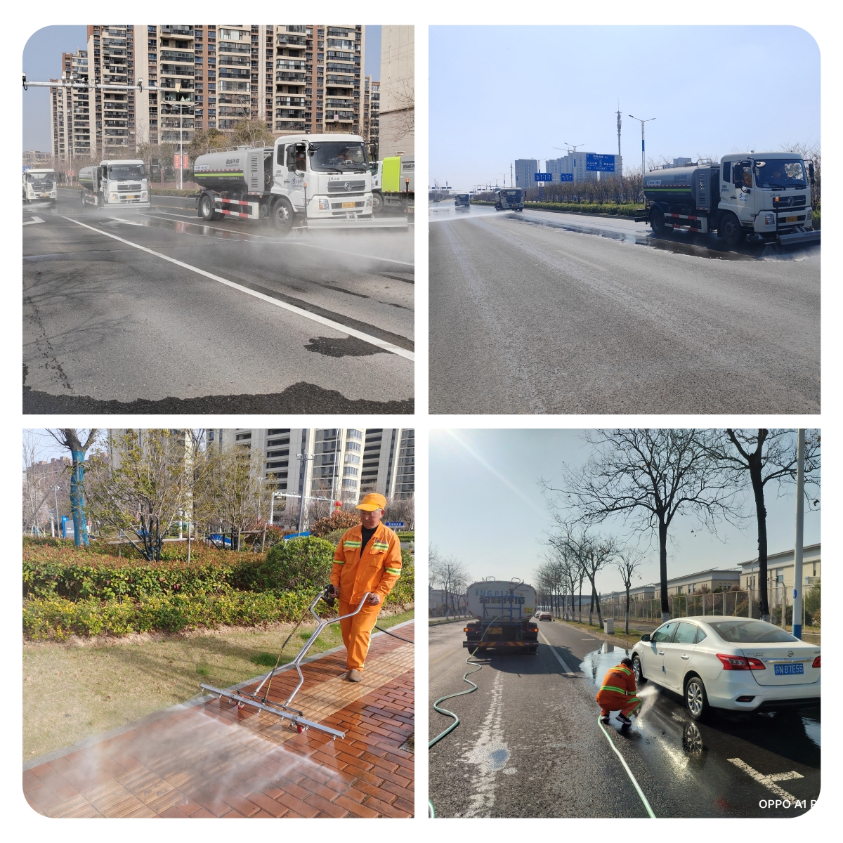 “平面”清洗,“洗”道路本色。采用“洗、沖、刷、掃”組合作業(yè),高壓清洗車、灑水車、洗掃車協(xié)同“作戰(zhàn)”,對(duì)園區(qū)主次干道進(jìn)行了深度清洗,確保道路恢復(fù)本色,標(biāo)線清晰。針對(duì)人行道、交叉路口、停車泊位等大中型車輛作業(yè)盲區(qū),使用小型高壓清洗車和人工沖洗進(jìn)行“補(bǔ)位”作業(yè),確保無盲區(qū)、無死角,實(shí)現(xiàn)清潔全覆蓋,讓園區(qū)每一條道路都“煥然一新”。