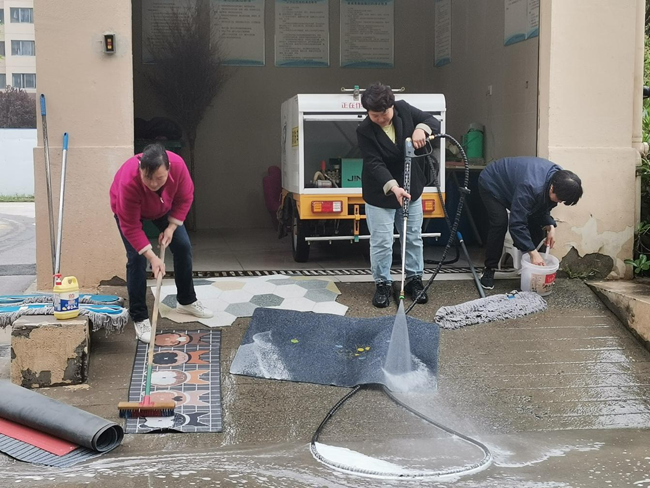 工作人員幫業(yè)主們清洗著臟臟的地毯,用高壓水槍耐心、仔細(xì)沖洗著地毯的正反面,小舉動(dòng),大關(guān)懷,每一次蹲下與起身,帶來的都是地墊的嶄新如初。