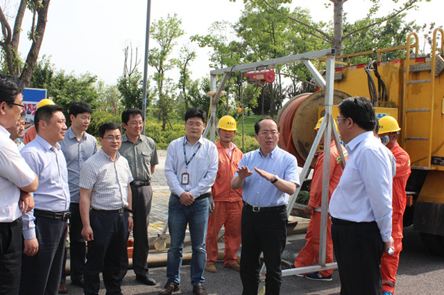 在同里湖路,李榮錦認真聽取了園區(qū)城市排水防澇工作進展情況匯報,現(xiàn)場查看了管道疏通清淤工作,并詳細詢問了管道CCTV檢測流程等情況。