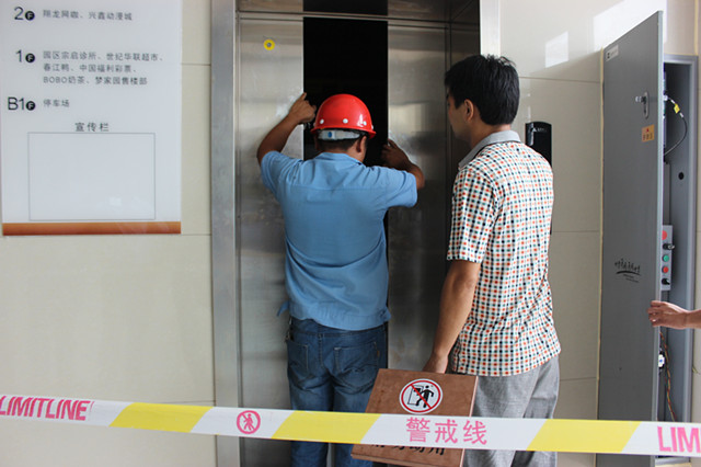 本次演練的模擬事件是圍繞在西楚金地內突發(fā)的一起電梯故障困人事件的應急救援。演練從上午9點30分準時開始,有兩名乘客乘坐的西楚金地1號電梯升至4層時突然遭遇電梯停電,乘客緊急按動報警按鈕,語音向中控室反映電梯突然停梯,梯內被困乘客兩名。中控室接到報警后,立即啟動“電梯故障困人應急救援預案”,一面安撫乘客,一面通知工程維修中心及維保單位。相關人員迅速兵分兩路,一路到電梯機房準備盤車,平層施救;另一路到救援樓層4層準備手動打開廳門,營救轎廂內被困乘客。從接到報警求助到救援結束,整個救援工作歷時8分鐘。