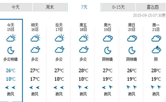 雖然氣溫有所回升,但從天氣預報來看,早晚溫差仍比較大。明天,最低氣溫17℃-18℃,最高氣溫26℃左右。后天,最低氣溫17℃-18℃,最高氣溫27℃。一天當中,忽冷忽熱的感覺仍很明顯。